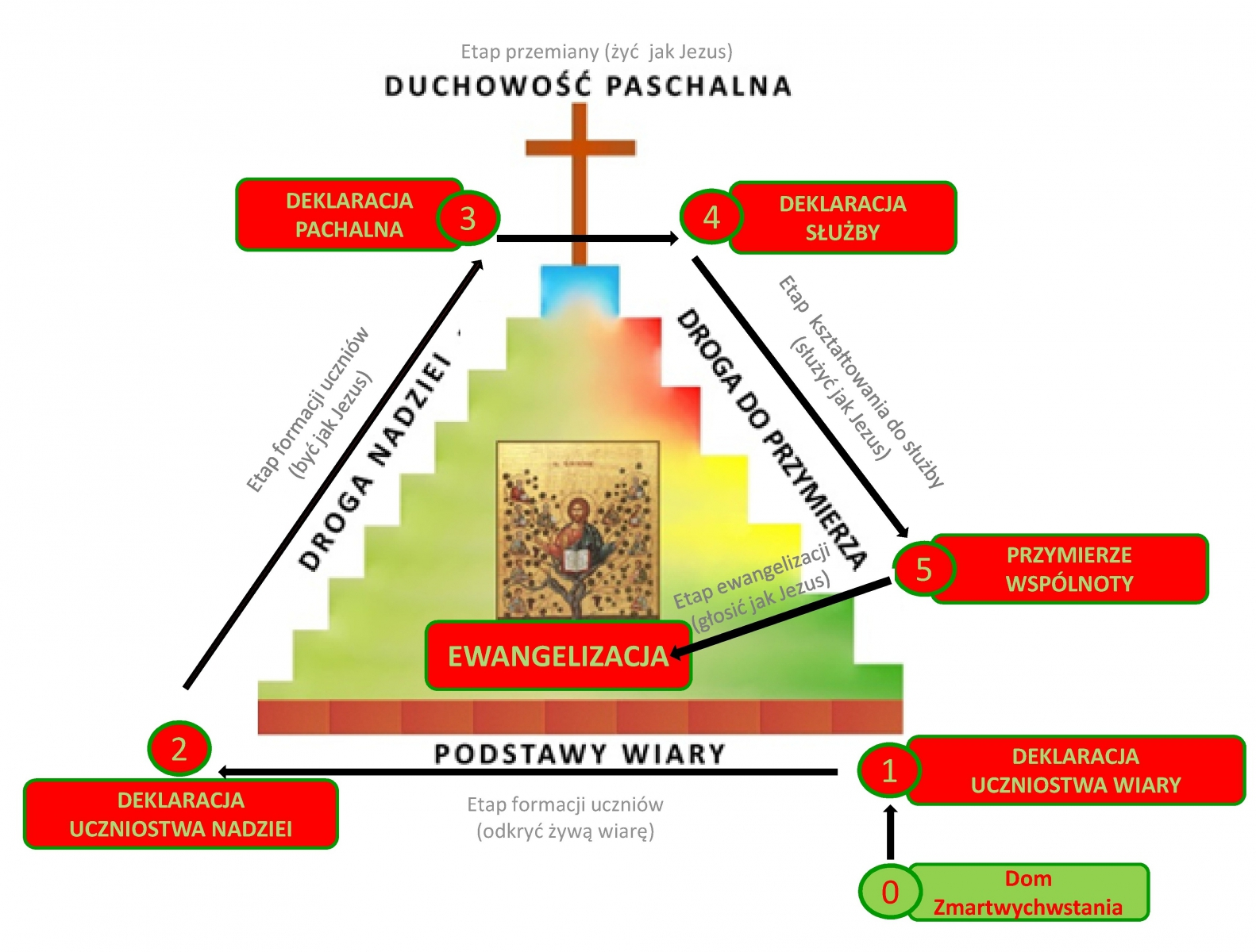 Formacja we Wspólnocie to droga wchodzenia na górę poznania Jezusa (formacji stawania się uczniem Jezusa), aby następnie będąc na szczycie doświadczyć głębokiej przemiany duchowej (zacząć żyć jak Jezus) i rozpocząć etap schodzenia do innych ludzi (ewangelizacji i służby), aby być jak Jezus i stawać się świadkami Jego Zmartwychwstania.